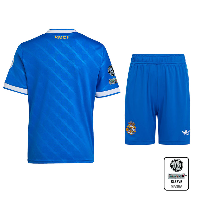 At home in blue. This juniors' third kit comes in a hue that's close to the hearts of Madridistas and 3-Stripes fans. A classic adidas Originals colourway and a subtle nod to the Bernabéu's identity, it's the perfect shade to celebrate the ultimate football partnership. Including a jersey, shorts and socks, this sized-down set ensures you stay dry, comfy and focused on your fandom. The player's number is subject to change until the closing of transfers. For this reason, no returns of custom jerseys will be accepted after such change.